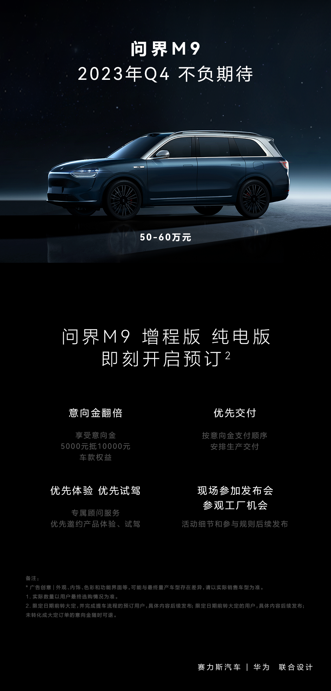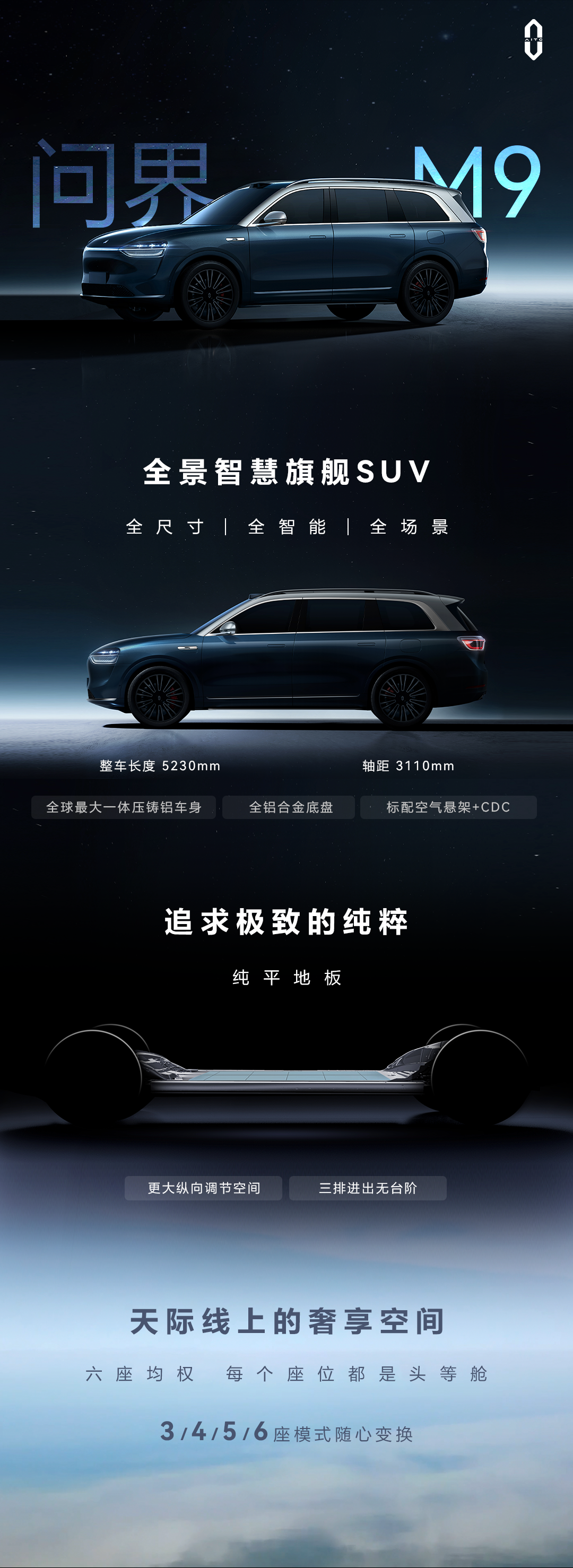 问界M9 全景智慧旗舰SUV (价格预计50万至60万,以Q4开售价格为准)